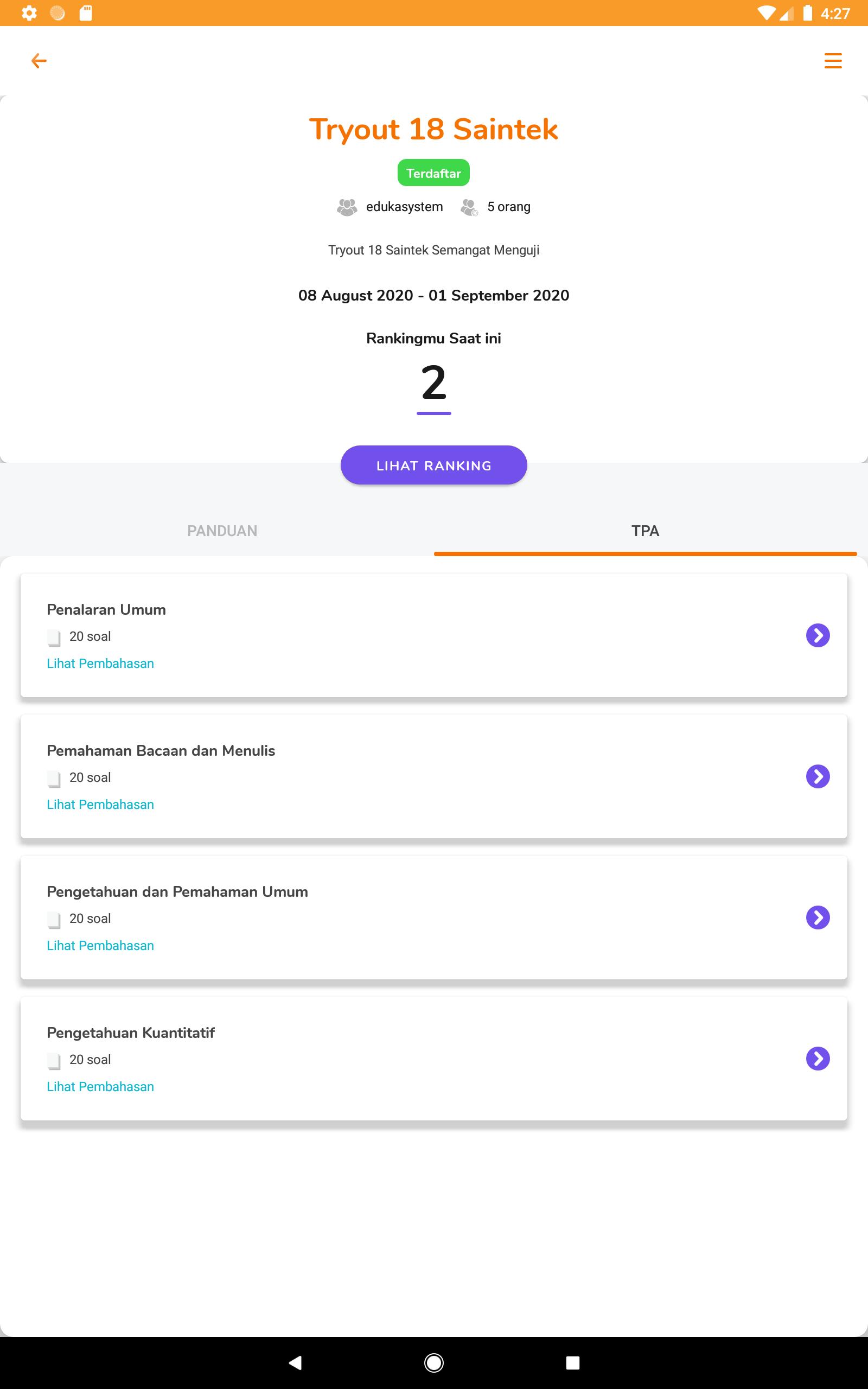 Download soal try out tps 1 eduka, free! Eduka system adalah aplikasi pembelajaran rangkuman dan bank soal lengkap buat kamu yang lagi sma. Solusi menghadapi tes un, sbmptn, cpns, psikotes, stan, toefl, dll secara gratis, agar bermanfaat untuk masyarakat indonesia, khususnya untuk sobat. Download prediksi soal utbk 2020 tps tka saintek. Simak yukk tutorial try out dibawah: Download soal dan pembahasan tps utbk sbmptn tahun 2021 2020 pdf. Soal dan pembahasan biologi sbmptn. Pembahasan soal eduka system guru ilmu sosial. Penyusun matriks berupa garam mineral pada jaringan tulang yang benar ditunjukkan oleh nomor …. Pembahasan soal eduka system guru ilmu sosial. Prediksi tka saintek 2021 + kunci jawaban. Prediksi tka soshum 2021 + kunci jawaban. Jangan lupa untuk selalu berdoa dan belajar.