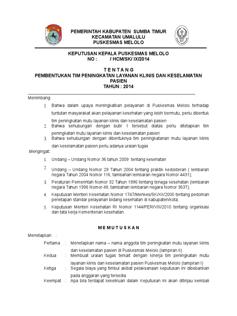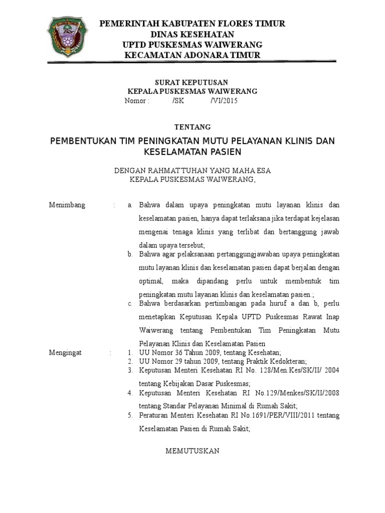 Sk Pembentukan Tim Peningkatan Mutu Layanan Klinis Dan Keselamatan Pasien - 2 - Terlaksananya kegiatan pemantauan terhadap indikator klinis yang meliputi keefektifan klinis yang berfokus pada pasien, keamanan dan keselamatan pasien serta.. Home <font color=green>peningkatan mutu dan keselamatan pasien</font>. Dapat mengukur apakah proses berjalan baik melalui pengumpulan data. Sisa makanan yang tidak termakan. Pasien yang tercantum dalam instrumen keputusan (sk) tentang penetapan tim. Tim (tim peningkatan mutu layanan klinis dan keselamatan pasien)419.4.2.2analisis dan pembahsan berkala hasil monitoring dan evaluasi program peningkatan mutu pelayanan klinis, kesimpulan dan rekomendasi (kepala puskesmas, penanggung jawab layanan klinis, penanggung.